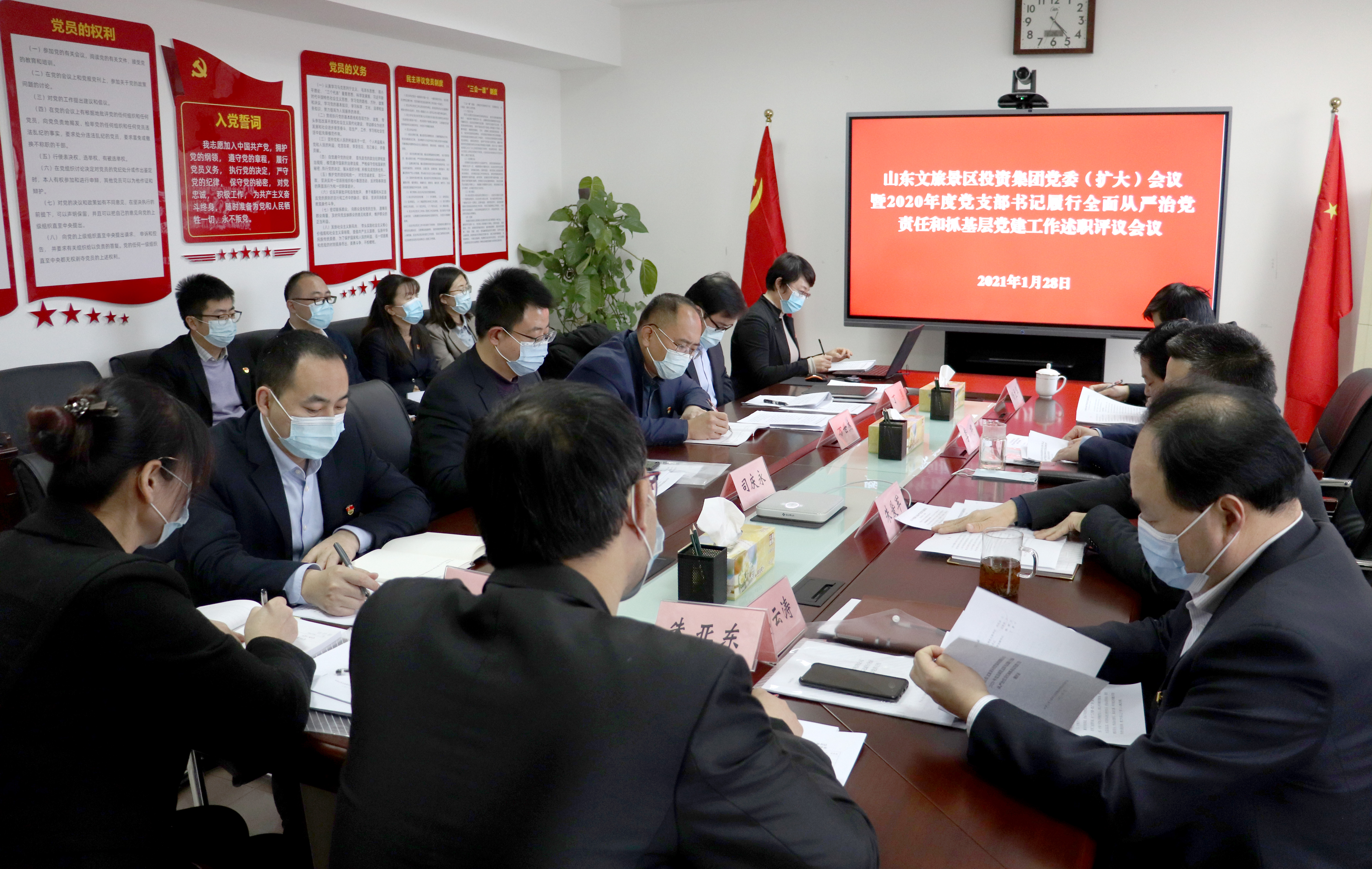1月28日下午,山东文旅景区投资集团有限公司(简称“景区公司”)召开党委(扩大)会议暨2020年度党支部书记履行全面从严治党责任和抓基层党建工作述职评议会。山东省国欣文化旅游发展集团有限公司(简称“国欣文旅”)党委委员、副总经理、景区公司党委书记、董事长季将主持会议并讲话,国欣文旅集团政工人力资源部副部长杨立华,景区公司领导班子,各党支部书记,基层党员代表参加会议。