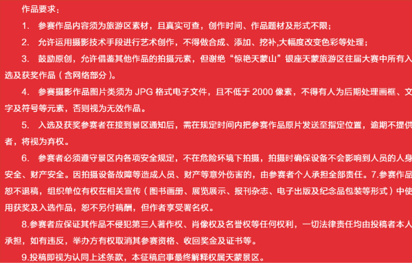 以上获奖作者各奖励价值480元的天蒙景区VIP年卡1张,获奖作品将在线上集中展出。