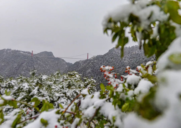 半山红豆半山雪,半是秋景半是冬!2020天蒙山的初雪如约而至,一山能赏两季的奇妙景致也在此刻呈现!初雪与红豆相遇,鲜明对比的“冰火两重天”,就在初冬的天蒙山,可以让人在一天之内感受两种不同的季节。
