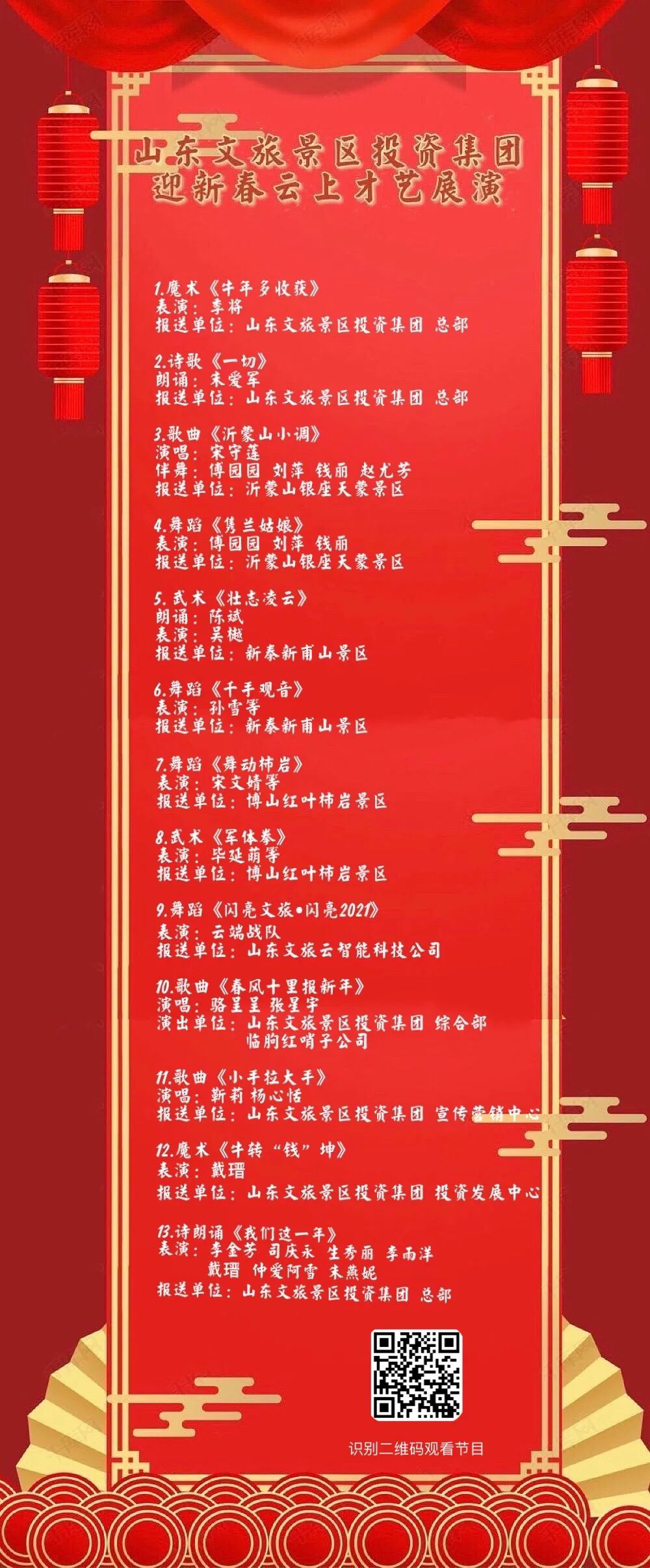搜索“山东文景投”微信公众号,在投票文章中,微信投票通道已开启,快来为你心仪的节目投票吧。观众可点击以下图片识别二维码进入山东文旅景区投资集团官网观看节目。