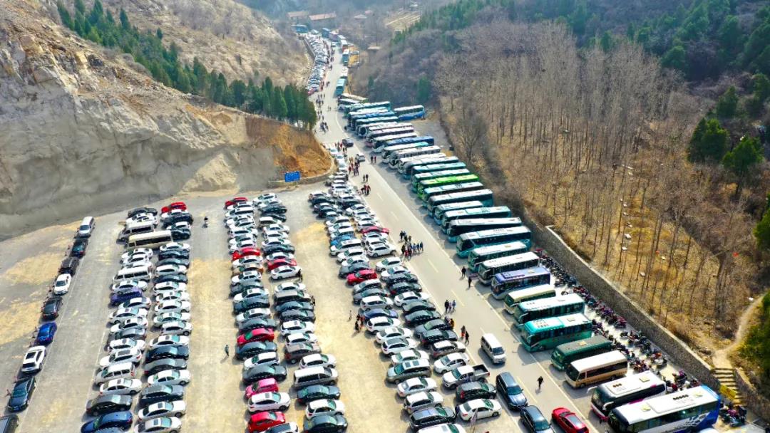 景区停车场的自驾车和旅游大巴达上千辆,来自各地的游客从早到晚络绎不绝,游客车辆排起长龙等候入园,延绵数里,秩序井然。