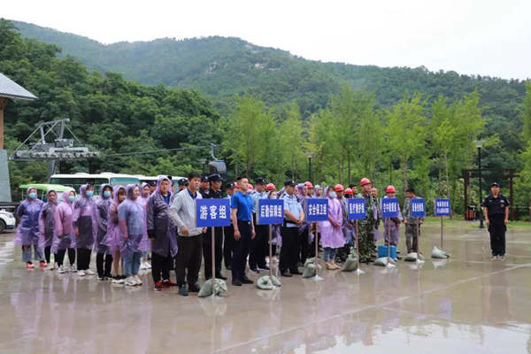 此次实战演练共设置观光车现场处置、山地医疗救护、极端灾害天气预警及游客转移、反恐防暴处置、索道救援等5个科目。
