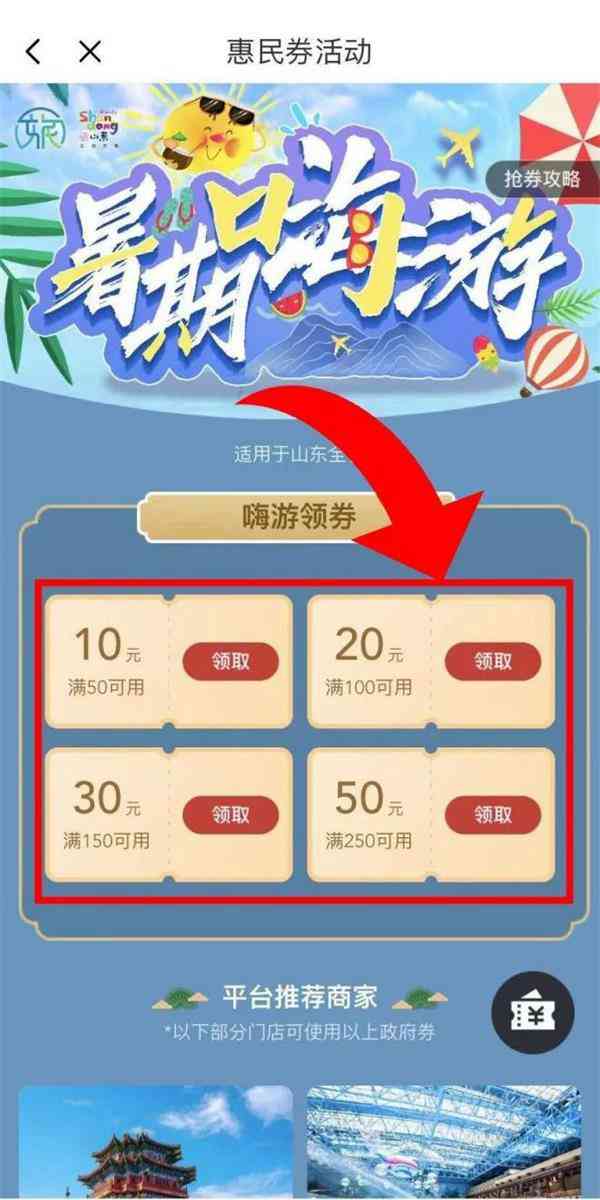 由省文化和旅游厅主办的第五届山东文化和旅游惠民消费季期间,为更好满足市民暑期出游需求,“花得少,玩得好”,作为官方指定发券平台,云游齐鲁智慧文旅平台(一部手机游山东)推出“万券齐发,惠游齐鲁”文旅惠民消费活动。即日起至10月底,登录“云游齐鲁”APP及微信小程序的惠民消费专区,领取专属文旅惠民消费券,即可参与活动,景区门票最高优惠50元。