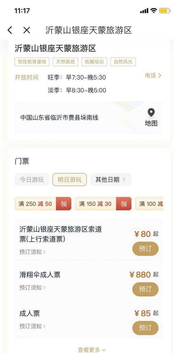 以银座天蒙山景区为例,点击进入购票页面选择门票并点击预订,就能使用刚才领取的优惠券。